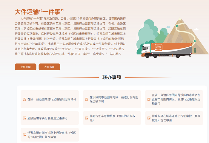联合省公安厅、住建厅印发《进一步优化大件运输“一件事”系统功能及建立审批联动机制的方案》,完善系统功能,支持跨部门业务一网联办、一表申请。通过电子证照共享和数据“最多采一次”,申请材料从20项减为8项,压减60%;跑动次数由3次减为1次,压减67%。“大件运输一件事”办理时限从法定36个工作日缩至10个工作日,压缩72.2%。