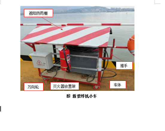 该新型焊机小车功能完备,移动灵活,1名工人便可以操作移动,很好的解决了保护焊机移动困难的问题,大大提高了劳动效率,降低了工人的劳动强度,配备了灭火器和遮雨棚消除了安全隐患。有效的保证了施工现场整洁度,提高了施工现场的标准化。
