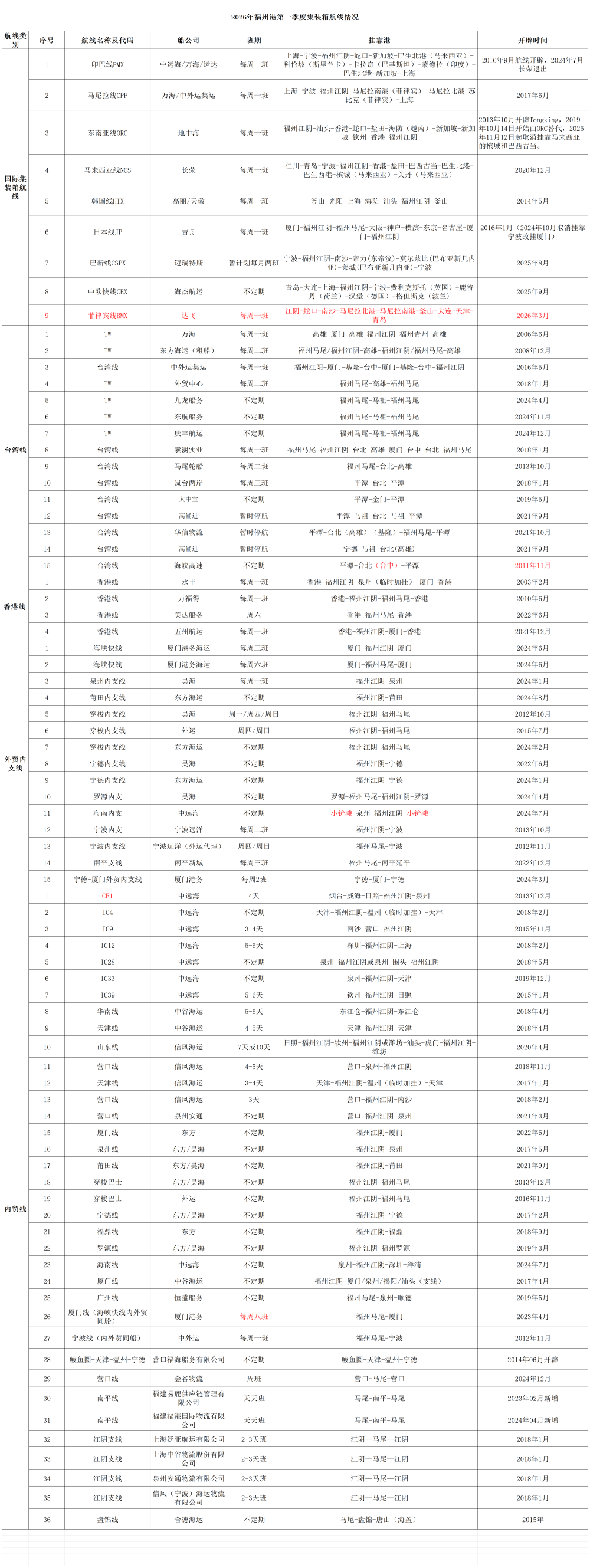2026年福州港第一季度集装箱航线情况