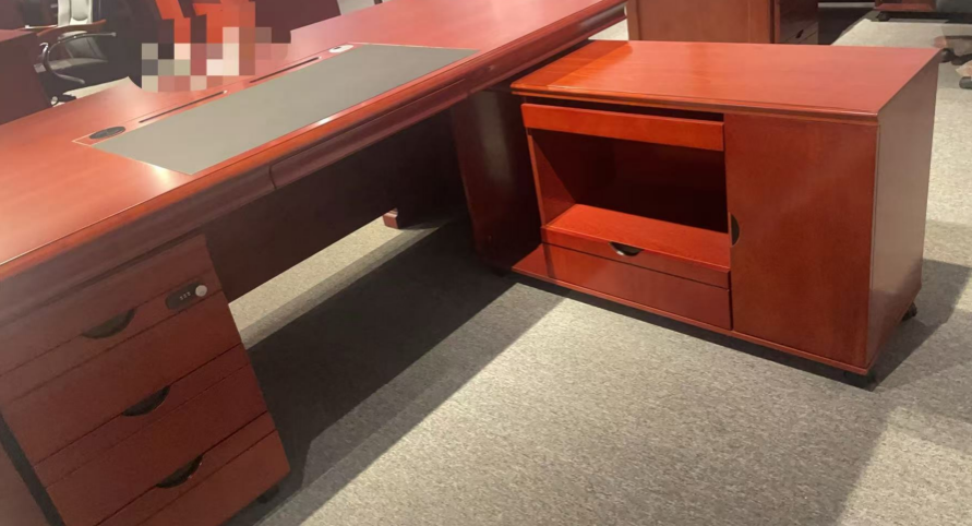 产品配置主桌、长柜、三抽柜,其中主桌尺寸为1600*800*760mm。产品应符合国家标准,采用环保板材,优质环保漆,实木封边,经过烘干,防腐,防虫处理,采用与家具颜色相协调的优质五金配件。