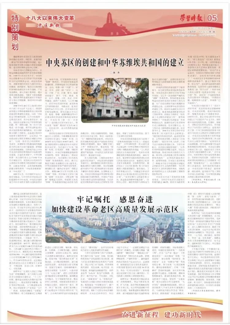 在大革命失败、土地革命战争兴起的历史背景下,中央苏区的创建和发展壮大,如同飘扬在南部中国崇山峻岭间的巨大鲜红旗帜,宣示和鼓舞着中国共产党人和革命群众为革命而不懈奋斗的伟大精神。从某种意义上说,中央苏区特别是中华苏维埃共和国如同新中国的雏形,中国共产党首先和主要在这里的局部执政,为后来延安时期和新中国成立后领导各方面建设,积累了宝贵的历史经验,留下了光荣的历史传统。