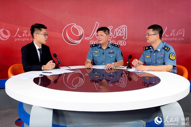 宁德交通执法支队福安大队办公室副主任林峰及龙岩高速支队二大队业务科科长范碧辉做客人民网福建演播室。(人民网 焦艳 摄)