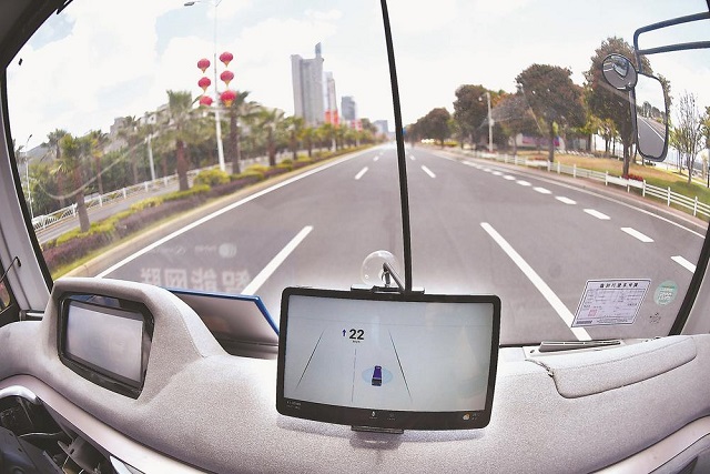 行驶中的5G智慧公交车(本报记者 林辉 摄)