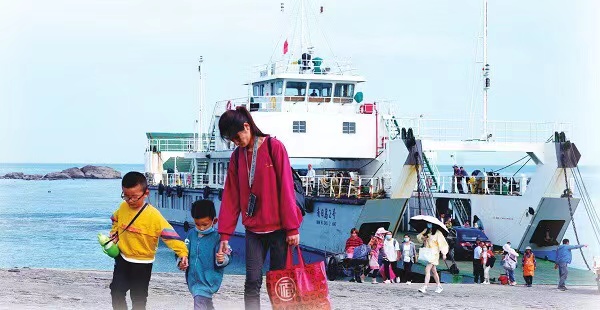 旅客在福建省莆田市秀屿区南日岛石城码头有序下船。(姚郑榕 供图)