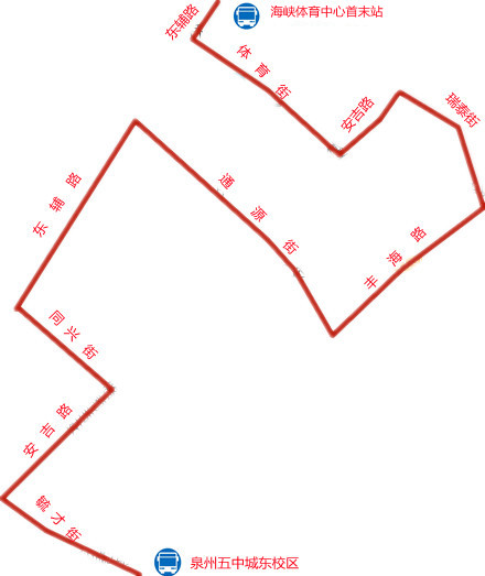 往:海峡体育中心首末站-东辅路(城东公交分公司招呼站)-体育街(喜盈门招呼站、体育街西段、世界城北门)-安吉路(泉州一院城东分院)-瑞泰街(泉州一院城东分院南门、裕景湾东北门招呼站)-丰海路(体育街口)-通源街(通源街东段、水墨芳林招呼站、世界城西南门、虎都招呼站)-东辅路(东辅路中段、东辅路南段)-同兴街(丰泽区城东消防救援招呼站、同兴街、保利城招呼站)-安吉路(埭头)-毓才街(老年大学城东校区)-泉州五中城东校区。