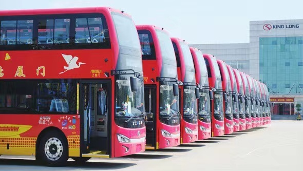 本报讯 近日,32辆金龙纯电动双层巴士在福建省厦门市公交线路投用,往返于厦门东西公交主干道——厦禾路、湖滨南路、莲前西路、仙岳路,为当地市民提供便捷、绿色出行服务。