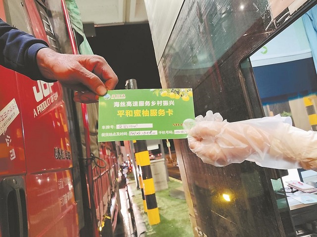 平和蜜柚运输抽免检试点将从省内抽免检的“1.0”版本升级到跨省抽免检的“2.0”版本。图为平和蜜柚运输试点省内抽免检后,一部绿通运输车辆凭借“平和蜜柚服务卡”实现抽免检快速通行。(詹鑫鹏 摄)