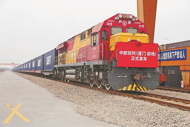 由厦门前场站始发的中欧班列停靠在铁路货场,整装待发。(何卫东 摄)