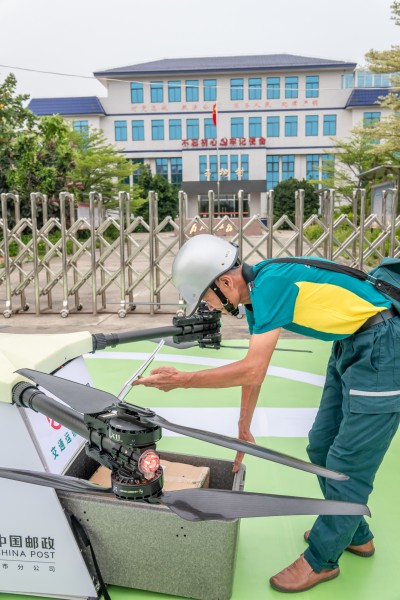 在龙海海澄玉枕渡口,随着起飞键的按下,一架无人机载着30公斤的邮件,腾空而起,以高于江面30米的高度跨九龙江飞行,2分半后,平稳降落于600米外的龙海市玉枕村党群服务中心,待邮递员取走邮件后自动返航。此次飞行高度达到30米,实现自主起降,自动化、智能化飞行。