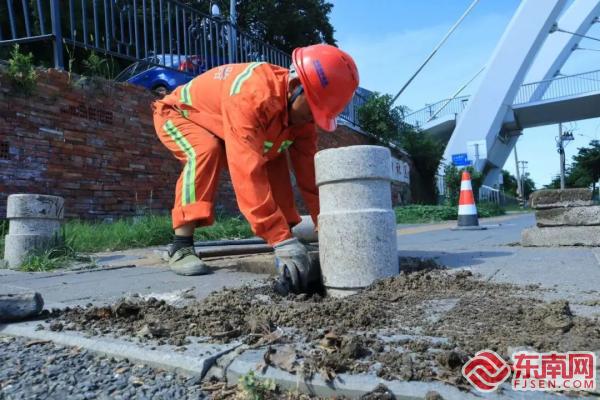 滨海西大道后田路段,养护工人们面对破损的人行道障碍墩,顶着烈日迅速开展更换工作。他们不畏高温,蹲下、起身、搬运,汗水沿着黝黑的皮肤流淌,浸湿了工作服。