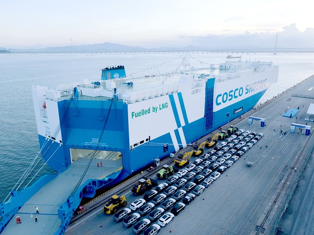 日前,中远海运特运运营的首批7500车位LNG双燃料新型汽车滚装船“辽河口”轮从福建厦门首航,搭载5000余辆商品车开启欧洲航程(如图)。同日,其姊妹船“闽江口”轮在上海完成装船作业后,搭载4800余辆商品车前往波斯湾。