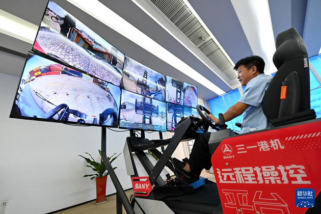 8月6日,厦门集装箱码头集团有限公司海天分公司装卸操作人员谢金强在厦门国际航运科创中心远程操控堆高机作业。