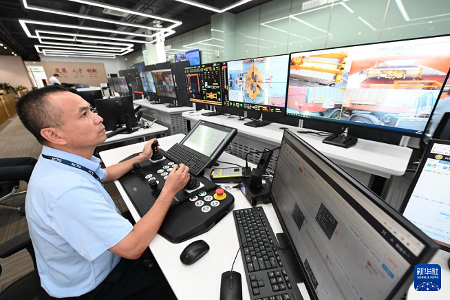 8月6日,厦门集装箱码头集团有限公司海天分公司装卸操作人员彭金小在厦门国际航运科创中心远程操控龙门吊作业。