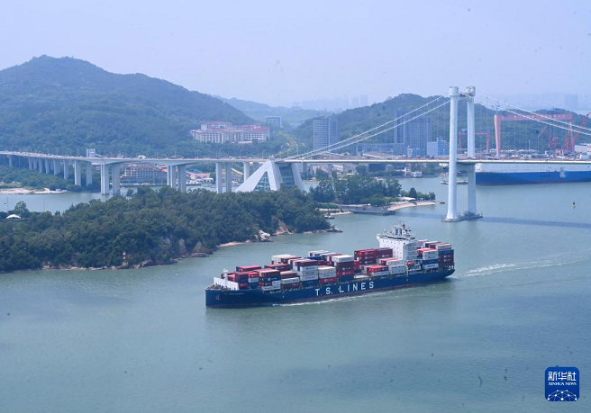 8月6日,由厦门港海天码头驶出的集装箱货轮经过厦门海沧大桥。