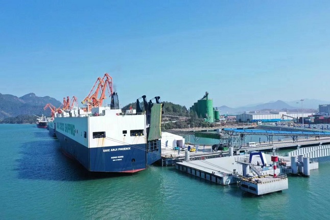 汽车通过滚装船出口海外。(上汽集团宁德生产基地 供图)