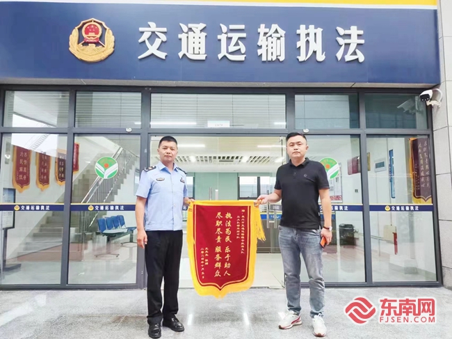 王先生(右)向执法人员表示诚挚的感谢,并主动赠送了锦旗。(泉州市交通运输局 供图)