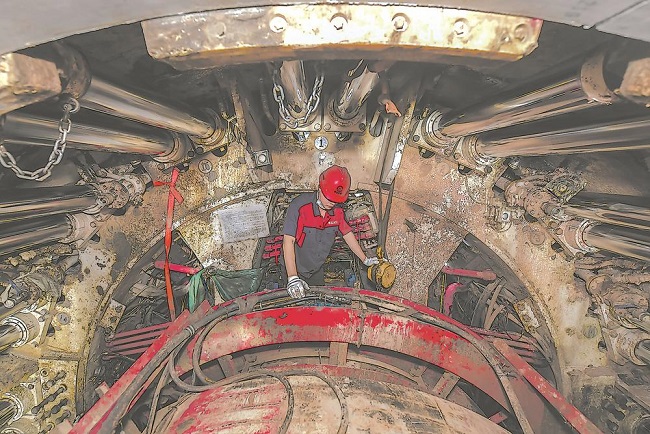 工人正在查看盾构机掘进情况。(陈暖 摄)