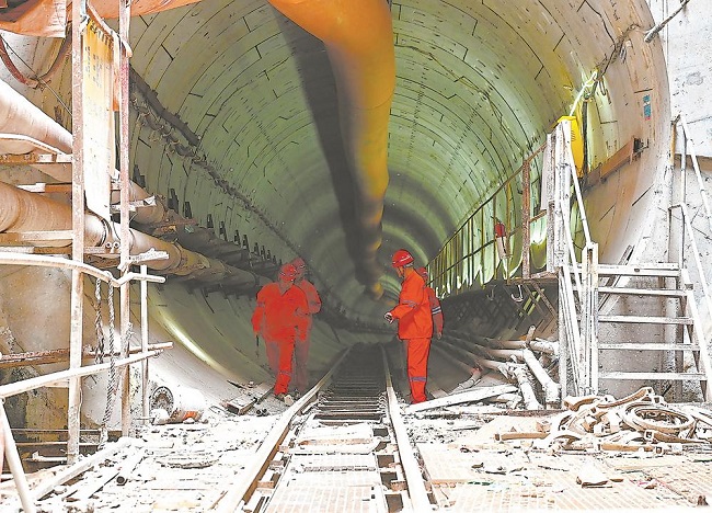 24日,施工人员在福州地铁4号线一期区间隧道内检查。(新华社)