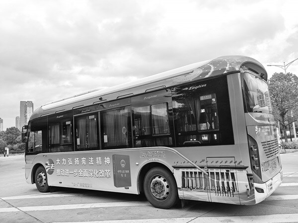 此次推出的宪法主题公交由康驰新巴士负责打造,整体以橙红色为基调,车身喷绘了“大力弘扬宪法精神 推动进一步全面深化改革”字样和特色的“法”字组成装饰,将宪法宣传与公交出行相结合,不断延伸法治宣传服务工作触角,打造流动宪法宣传阵地,推动宪法宣传走进市民群众日常生活。