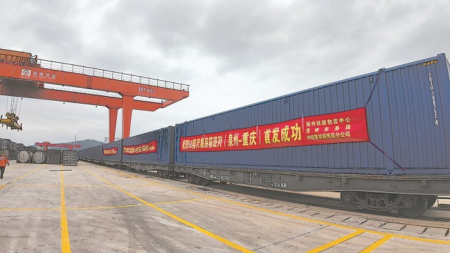 本报讯(记者 张颖 通讯员 左鸿文 周敏) 12日,随着笛声长鸣,一列搭载10个50英尺集装箱的27004次货物班列缓缓驶出福州铁路物流中心黄塘营业室货场,前往重庆方向。这是福建开出的首趟使用50英尺集装箱运输的白货班列,对于进一步提高货物运输效率、推动铁路现代物流体系建设具有重要意义。