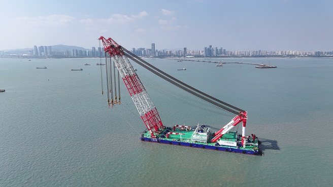 福建厦门,厦金大桥(厦门段)停泊的国内最大双臂架变幅式起重船。