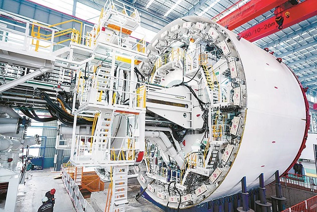 15日,福建省隧道工程最大直径的盾构机“厦金号”在江苏省南通市中铁十四局集团盾构机总装车间下线。(林梓健 摄)