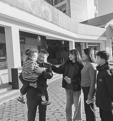 钟瑜快步走向服务区入口,远远便看到了家人的身影。女儿兴奋地挥舞着小手,大声喊着爸爸,钟瑜一把将女儿抱了起来。妻子走上前,笑着说:“我们来陪你过年啦。”短暂的相聚后,钟瑜继续投入工作中,妻子和父母到小吃档口帮忙,女儿则像小尾巴一样跟在钟瑜身后,好奇地打量着周围的一切。