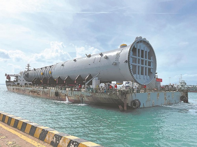 17日至18日,大件运输船“江海骏驰”轮安全靠泊古雷港区南11^#泊位。该轮载运的洗涤塔以总长109米、最大直径10.2米、总重2465吨的超限体量,刷新了全球同类型设备纪录。此次靠泊滚卸,标志着中沙古雷乙烯项目建设驶入快车道。