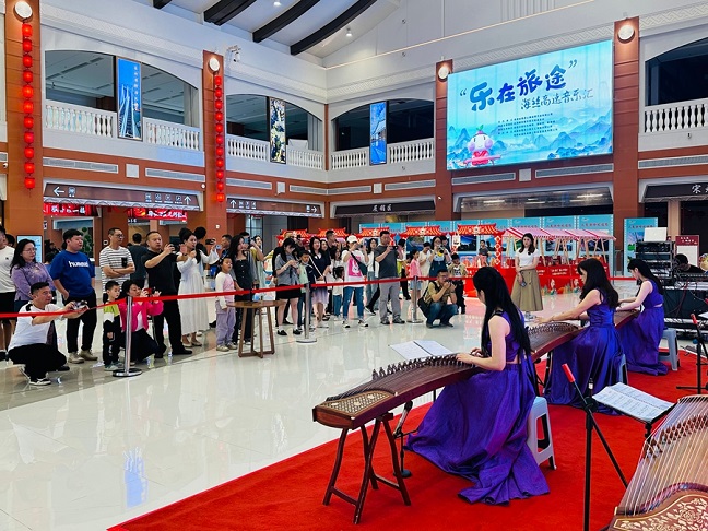 在音乐汇现场,来自台湾的四象筝乐团演绎了多首融合流行与传统元素的古筝曲目。悠扬婉转的乐声在服务区内回荡,旅客们纷纷驻足聆听,不少人还拿出手机记录下这美妙的瞬间,现场掌声与赞叹声此起彼伏:“就像七仙女!非常美!”