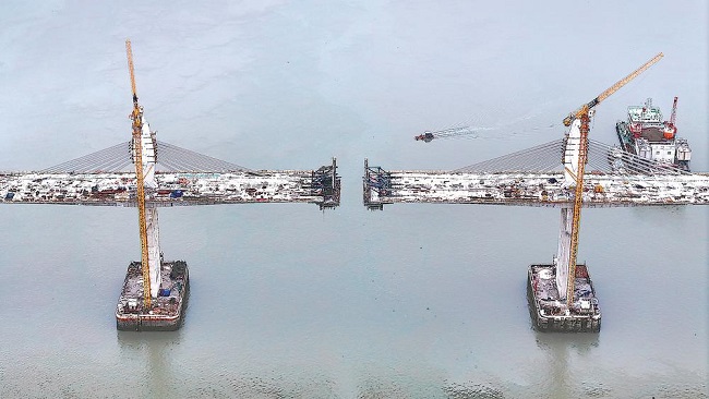 据了解,东吾洋特大桥全长2546.6米,是宁上高速公路的重要控制性工程。目前,该特大桥的桩基施工已全部完成(最大桩长144米),承台、墩柱、盖梁等工程均按序时进度推进,悬浇节段箱梁累计完成63节段,占比82%;斜拉桥3座主塔已全部完成,斜拉索施工累计完成81%。