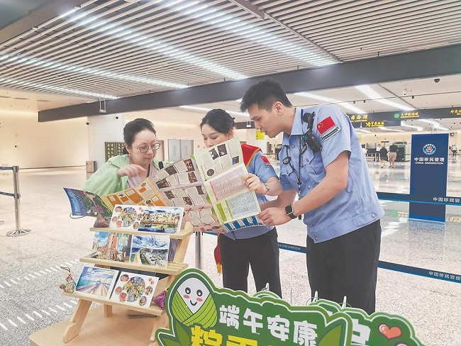 在厦门国际邮轮中心边检执勤现场,高崎边检站布置了具有端午民俗和中华传统文化元素的装饰,通道上方挂上了艾草粽子、粽子风铃等挂件,并向来厦的外籍旅客赠送香囊、五彩绳等,带领旅客一同感受中国传统佳节。