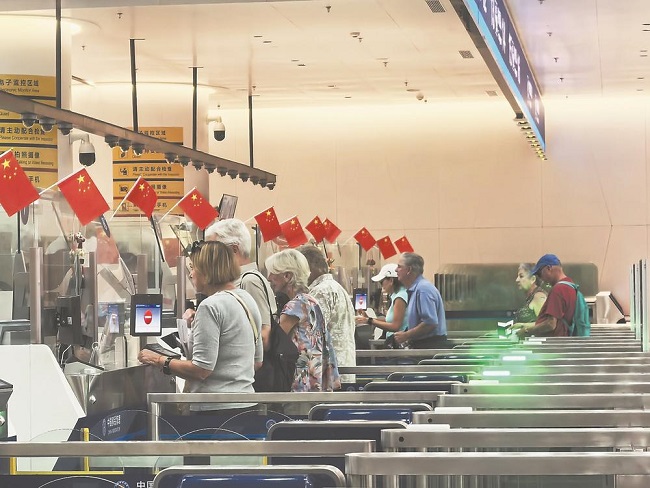 政策红利的不断释放,让越来越多的外籍旅客选择乘坐邮轮来华开启一场说走就走的旅行。“这是邮轮新航站楼启用以来,厦门国际邮轮中心迎来的首艘访问港邮轮,针对邮轮靠泊时间短、外籍旅客比例高的实际情况,我们主动对接代理、码头以及地接旅行社,及时掌握邮轮入港、出境动态和通关安排。同时充分联动文旅、船方积极对外宣介、引导随轮外籍旅客用好用足各类免签政策,保障邮轮旅客‘靠港即下’。”高崎边检站边防检查处处长沈文娟介绍。