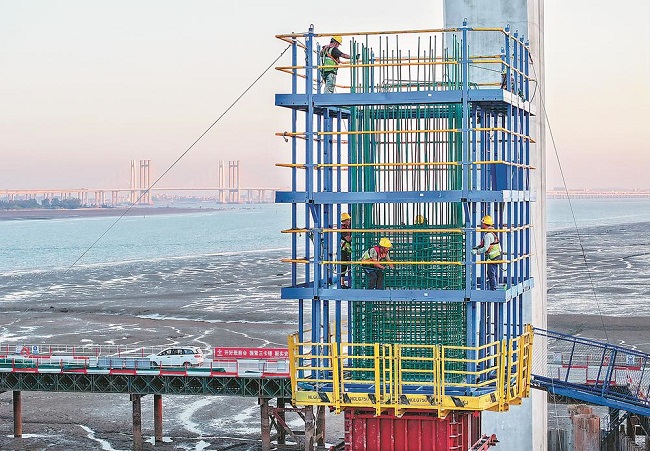 5日,工人在泉州百崎通道项目施工现场忙碌。节日期间,泉州市各在建重点项目的建设者坚守岗位,确保工程进展顺利。