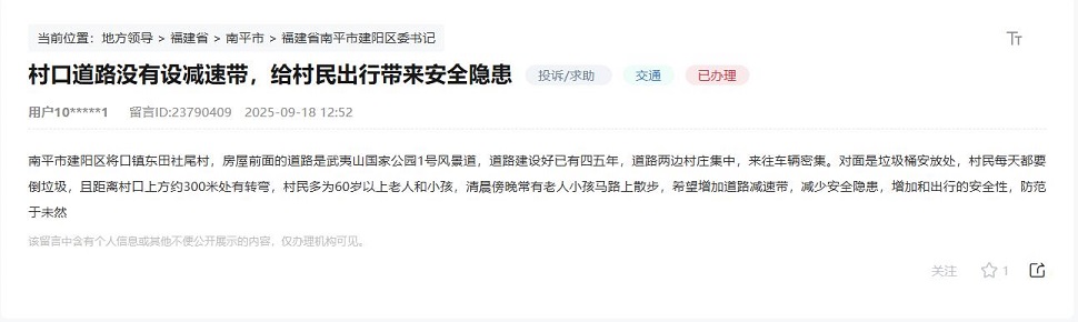 人民网南平10月18日电(记者 刘宝琴) 近日,福建省南平市群众游女士通过“领导留言板”反映,武夷山国家公园1号风景道公路从建阳区将口镇东田社尾村穿过,车流量变大,希望在村口位置增加道路减速带,减少安全隐患。