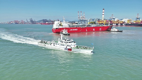 11月7日,在厦门海事巡逻艇的护航下,厦门港成功完成首单国际航行船舶保税液化天然气(LNG)“船对船”加注作业。