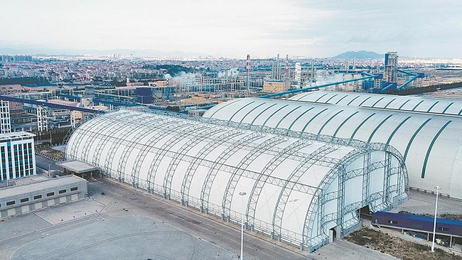 23日,全国首座钢结构硫酸铵仓储棚在湄洲湾港秀屿港区石门澳作业区正式投入使用。该硫酸铵棚采用钢结构桁架设计,可储存硫酸铵6.7万吨。项目创新运用管桁架反吊膜技术,防潮防尘、降低天气因素影响的同时,从根本上解决了钢结构易受侵蚀的行业难题,斩获中国建筑钢结构行业最高荣誉——“中国钢结构金奖”。