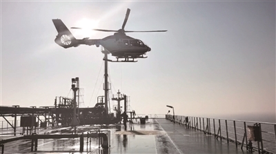 天津港引航员从直升机索降登轮。