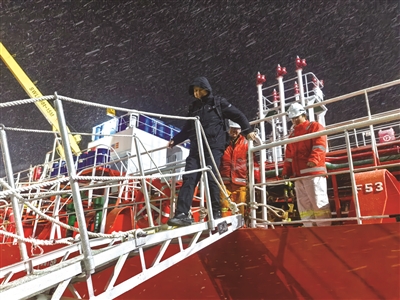 引航员在风雪中完成引航任务下船.